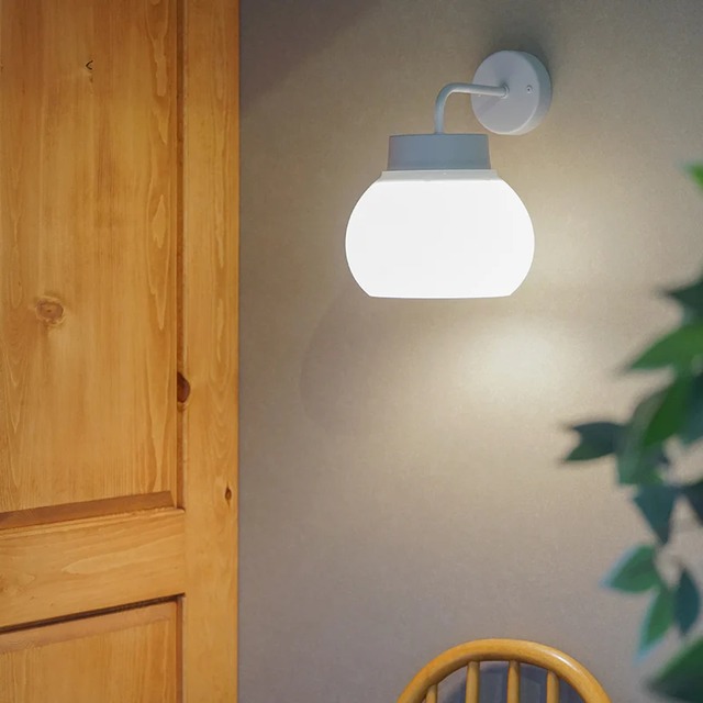 心地良いあかりを生み出す「kom(コム)」。ドイツ語の”komfort=快適・居心地”という言葉から名付けられた照明シリーズです。上下がオープンになったシェードは光が上下に抜けて、天井や手元を照らします。また、乳白ガラスは光を半透過して拡げるため、空間全体がアンビエントに明るくなります。 「kom bracket light 」はシェードとブラケット灯具がセットになった壁付け照明です。シェードや灯具の構造を工夫してあるので光源が直接目に入りにくく、不快なちらつき=グレアを抑えた仕様になっています。 洗面所や階段などに設置すれば、ポッと灯るあかりが雰囲気良く、あたたかなムードの空間を演出してくれます。 ※設置の際、壁内部の電気配線と本体を繋ぐ「直接結線」が必要となります。必ず電気工事士資格者による取り付けをお願いいたします。 ※電球は付属しませんので、別途ご用意ください。 [品番:L2173] サイズ:約w196×d248×h264mm サイズ:(台座)約直径90mm サイズ:(シェード)約直径196×h129mm 重量:約890g 素材:(シェード) ガラス 素材:(灯具) 鉄、その他 適合電球:E26口径LED電球専用 保証期間:お買い上げ日より1年 【適合電球】 kom bracket lightには「HS3310 ボール型LED電球E26乳白 100W相当」のご利用をおすすめしております。クリア電球を使用するとフィラメントの影が映ってしまうことが理由です。 【ご案内】 ※PSE取得済み ※人感センサー・調光スイッチは対応不可。 ※ホタルスイッチと組み合わせてご利用される場合、正常に点灯しない場合がございます。 ※アクシス製の電球のご利用を推奨。
