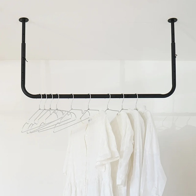 室内で洗濯物を干したり、コートハンガーやディスプレイバーとしてもお使いいただけるパイプハンガーです。 生活感が出てしまう洗濯物の室内干しですが、アイアンのパイプハンガーであればインテリアを邪魔せず設置ができます。また、アウターなどを掛けるのに使用したり、プランターやモビールを吊り下げるディスプレイアイテムとしてもおすすめです。 品番:HS3092 サイズ:900 最短:約w982 × d60 × h360mm 最長:約w982 × d60 × h510m サイズ1550 最短:約w1570 × d60 × h360mm 最長:約w1570 × d60 × h510mm 素材:鉄 セット内容 900:吊り下げパーツ、コの字型パイプ、ロックピン 1550:吊り下げパーツ、L字型パイプ、T字型パイプ、ロックピン 耐荷重(静荷重) 約20kgまで(木ネジ:太さ3.5×長さ32mmを使用、天井下地材(木材)使用の場合) ※危険ですのでパイプにぶら下がらないでください。 ※取付ける際には必ず施行業者にご相談の上、取付けをして下さい。 ※取付ビスは付属しておりません。 ※必ず下地のある箇所で取り付けてください。 設置する箇所の事前確認 ①天井の取付け面が床と水平になっている事をご確認ください。 傾斜天井には取付け出来ません。弊社では傾斜天井に設置するためのパーツは販売しておりません。既存のお住まいには取付けできない場合が多いので、必ず下地の確認が必要です。 ②天井の取付け面に、下地処理(コンパネ合板等)を施してあるかを確認して下さい。 ③RC造などの場合はアンカーなどを適正に選択し取付け下地に合わせた取付けを行ってくだい。 取付け方法 本製品は、新築及びリフォームの際に取付けをお願い致します。 下地が無い天井には取付け出来ません。 取付ける際には必ず施行業者にご相談の上、取付けをして下さい。 ①十分な下地を確保し、吊下げパーツの取付け位置を確認します。 ②吊下げパーツを取付け位置に取り付けます。 その際、設置する箇所の素材によって変わるので、安全に配慮して設置してください。 下地がある場合のビスのサイズ M4 x 40又はM5 x 50を推奨いたしますが、取付け下地に合わせたビスを選択してください。 取り付けが不十分の場合、ハンギングした際に落下の危険があります。 ③コノ字型パイプを天井に設置した吊パーツに挿し込み、お好みの高さにコノ字型パイプを吊り下げ パーツの穴に合わせ、ロックピンを挿し込んでで固定します。
