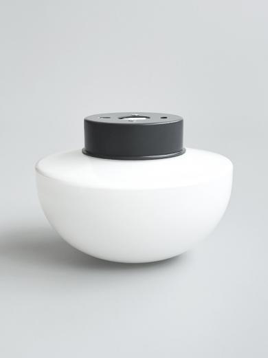 国内工場にて熟練の職人が手作業で製造を行い、 厚みのある乳白ガラスの正確な成形や、スチール部分のヘラ絞り、焼付塗装などを丁寧に仕上げています。