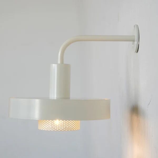 シェード直径約16cm×高さ約16cm×出しろ約20cmの、コンパクトなウォールライトです。電球を覆う部分に穴の空いた鉄の板=パンチングアイアンプレートを使用しているため、適度に光を抜けさせながらも、目眩しさを低減させています。