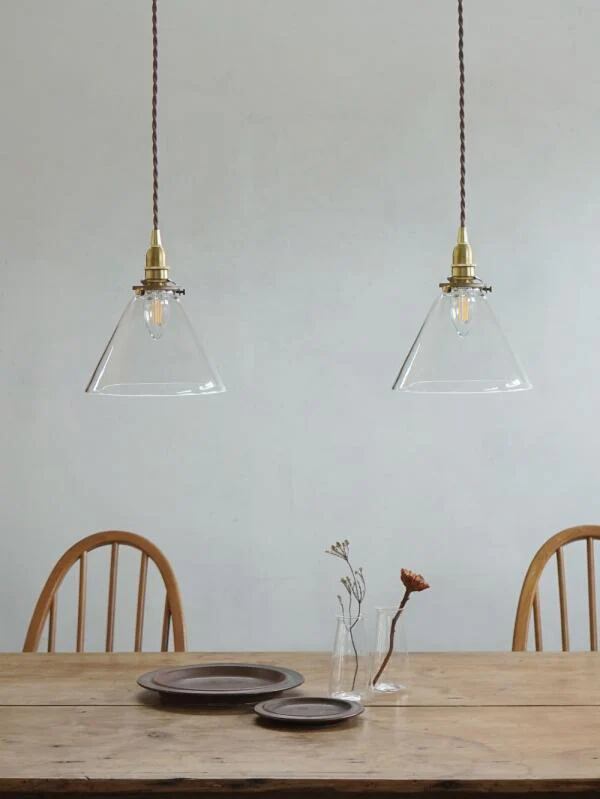 すとんとした円錐形フォルム、厚手のガラスを使用した存在感あるガラスシェードです。ダイニングの照明としてお使いいただくのに丁度いいミドルサイズタイプです。