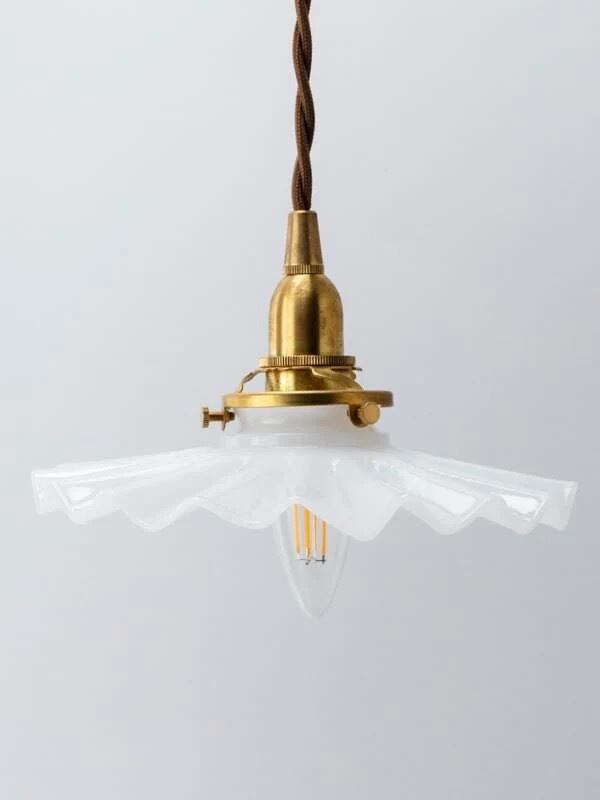 貝殻のように波打つプリーツがエレガントなコンパクトサイズシェードです。乳白色のミルクガラスはアンティークライクなムードたっぷり。光をともすとシェードがほんのりと光を通し、懐かしい雰囲気を漂わせます。