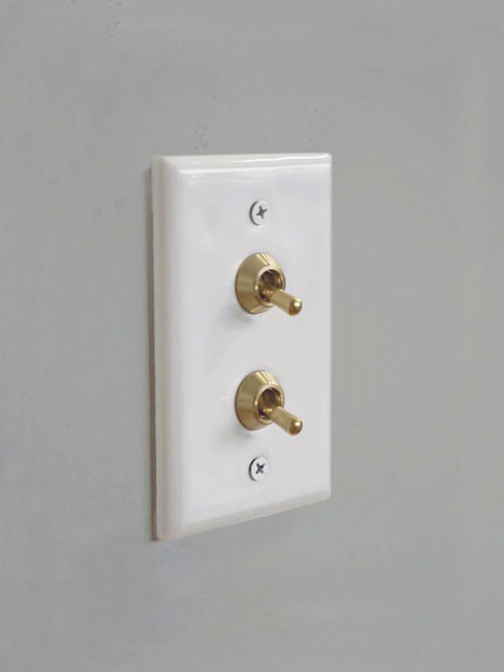 [すっきりとしたセラミック製のトグル式スイッチです。外国のホテルやシャワールームにありそうなシンプル&クリーンな雰囲気や、重厚感ある見た目が特徴的。汚れにくく清潔感がある素材なので、洗面所やお手洗いにぴったりです。