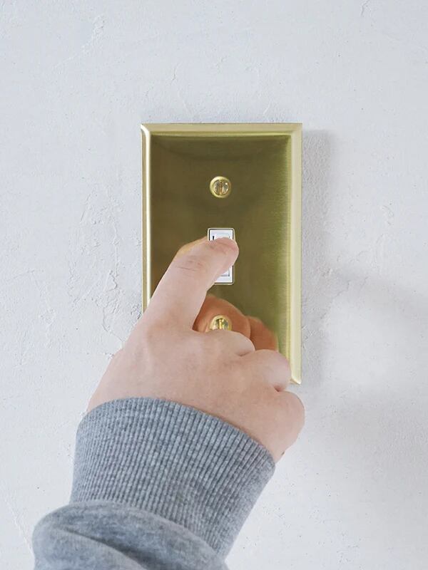 カチッという小気味の良い音とともに明かりが灯る、ミニマルで工業的な雰囲気のアメリカンスイッチ。そのアメリカンスイッチ専用の「スイッチプレート」です。真鍮素材は使い込む内に渋い色味に変化するのが特徴的。仕上げに塗装を施しているため、無塗装の真鍮より穏やかに経年変化してゆきます。