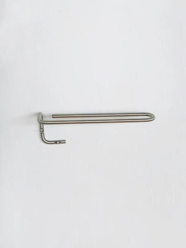 「renステンレスタオルハンガー」は、ゆったり使えるタオル掛け。付属のビスで壁に取り付けて設置します。バー部分が二重になっている構造は、タオルを掛けた時あいだに空間ができて、タオルが乾きやすいデザイン。フェイスタオルを折らずに掛けられるサイズなので、洗面所やバスルーム周りで活躍します。