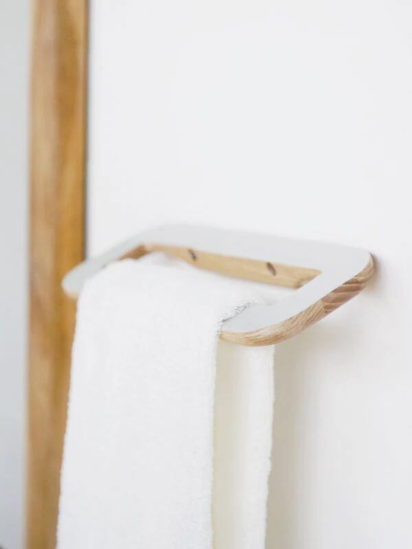 「rum タオルハンガー グレー」は、立体的なフォルムのタオル掛け。奥行きがあるスクエアリング型のハンガー部にタオルを掛けるので、水気が乾きやすく衛生的な状態を保てます。斜め下に突き出すデザインは、タオルを掛け外ししやすい構造。一般的なボディタオルなら、Sサイズは縦半分に二つ折り、Mサイズは畳まずにそのまま掛けられるサイズ感です。