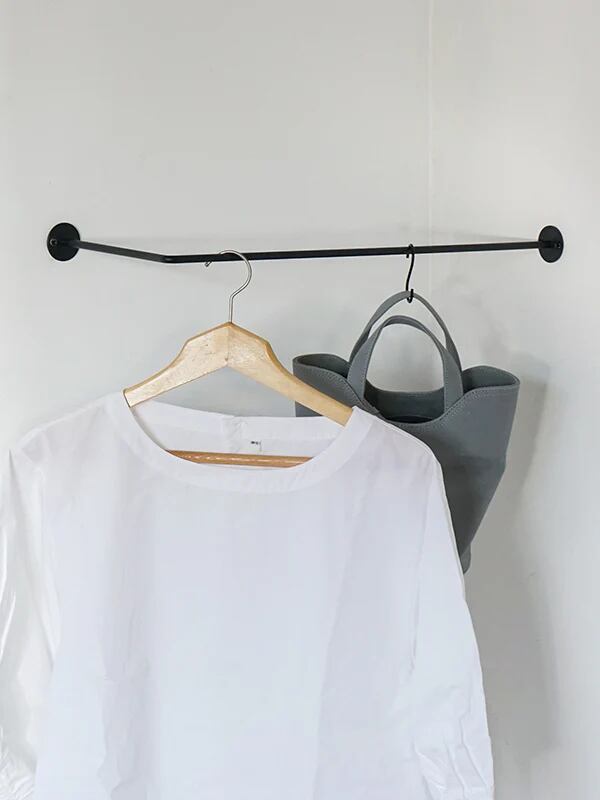 シンプルなアイアンのL字型バーです。洋服をかけたり、植物をハンギングするのにもお使い頂けます。お部屋の角部分に設置すればさまざまなものを引っ掛けて置く事ができます。
