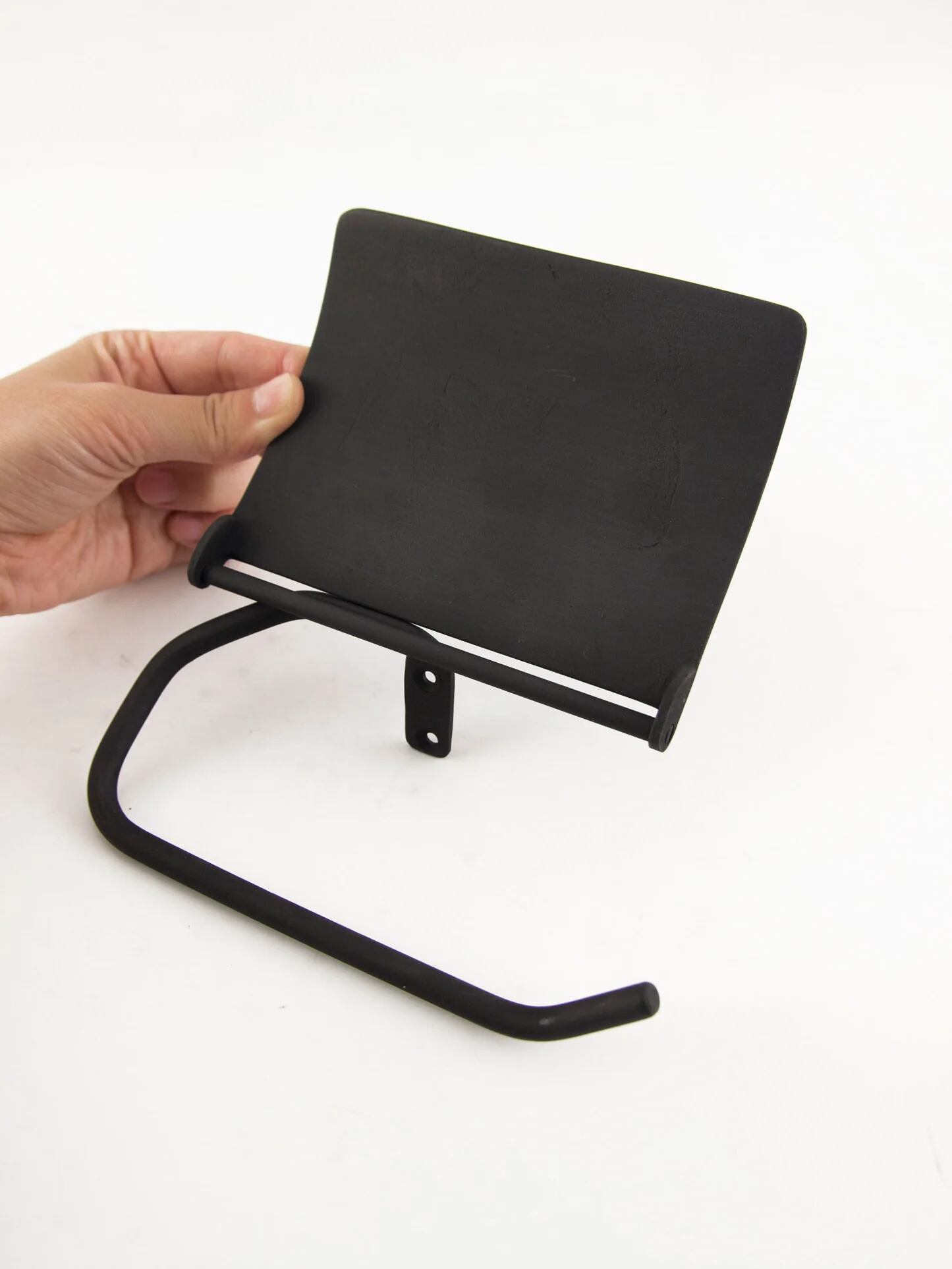 マットブラック塗装の真鍮製トイレットペーパーホルダーです。シンプルなデザインですが、シックで落ち着いたテイストが魅力です。無骨さも感じられるマットな仕上がりは、シンプルやモダン、インダストリアルなどどんな雰囲気やテイストにも馴染む色合いです。