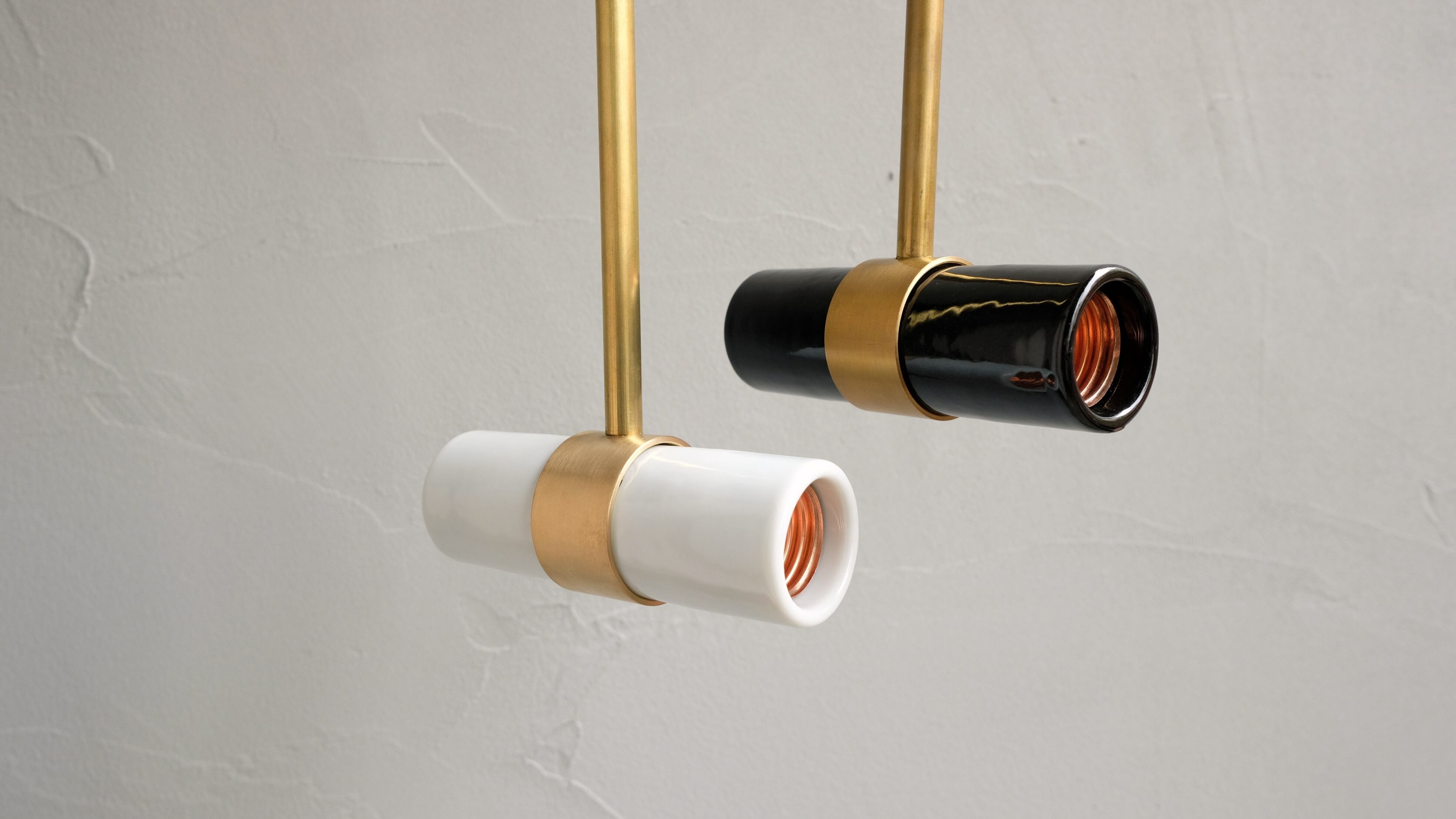 陶器製のダブルソケットに真鍮のパーツをあわせ、シンメトリーに取り付けた電球がデザインの一部として楽しめるランプ。