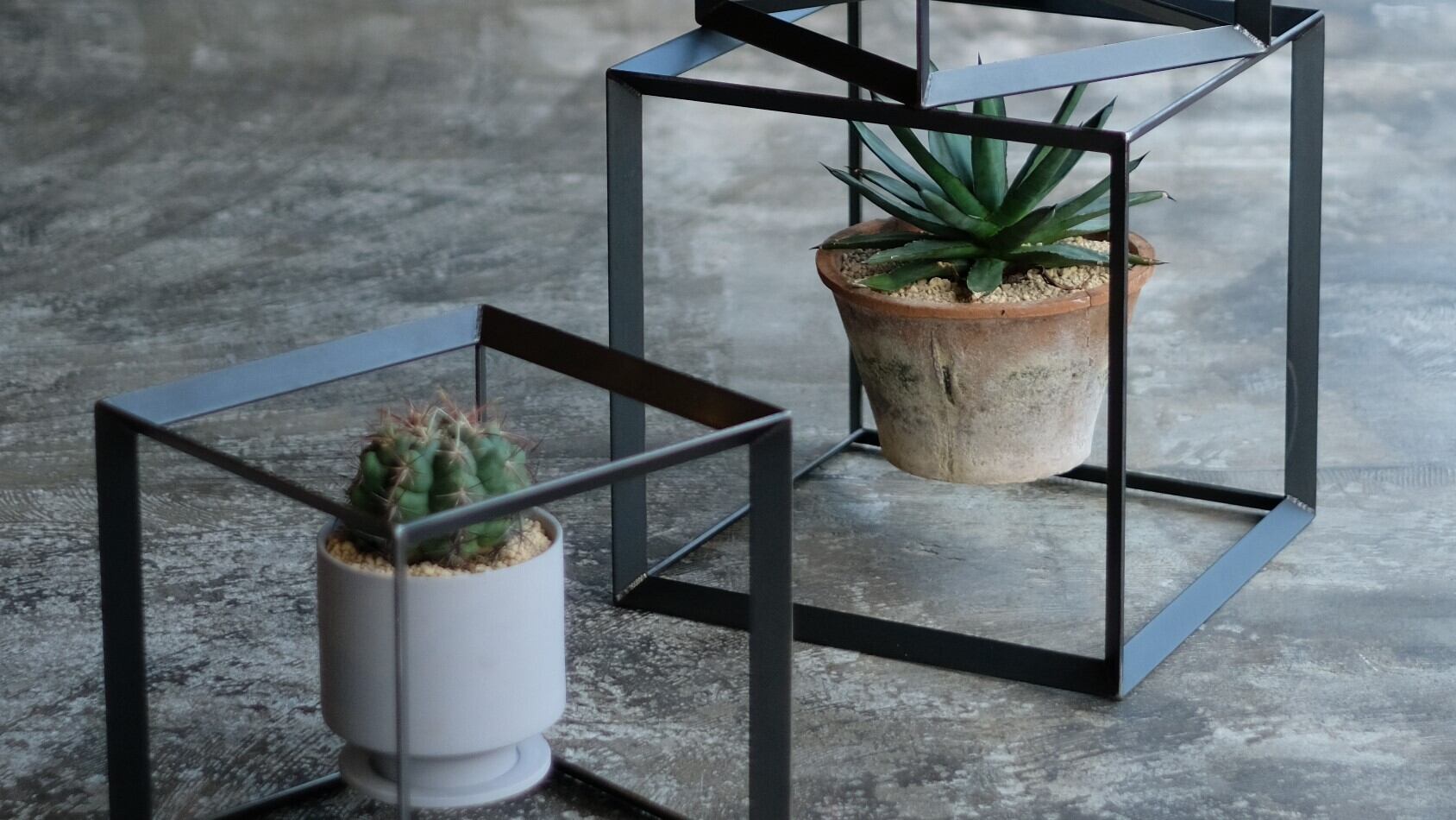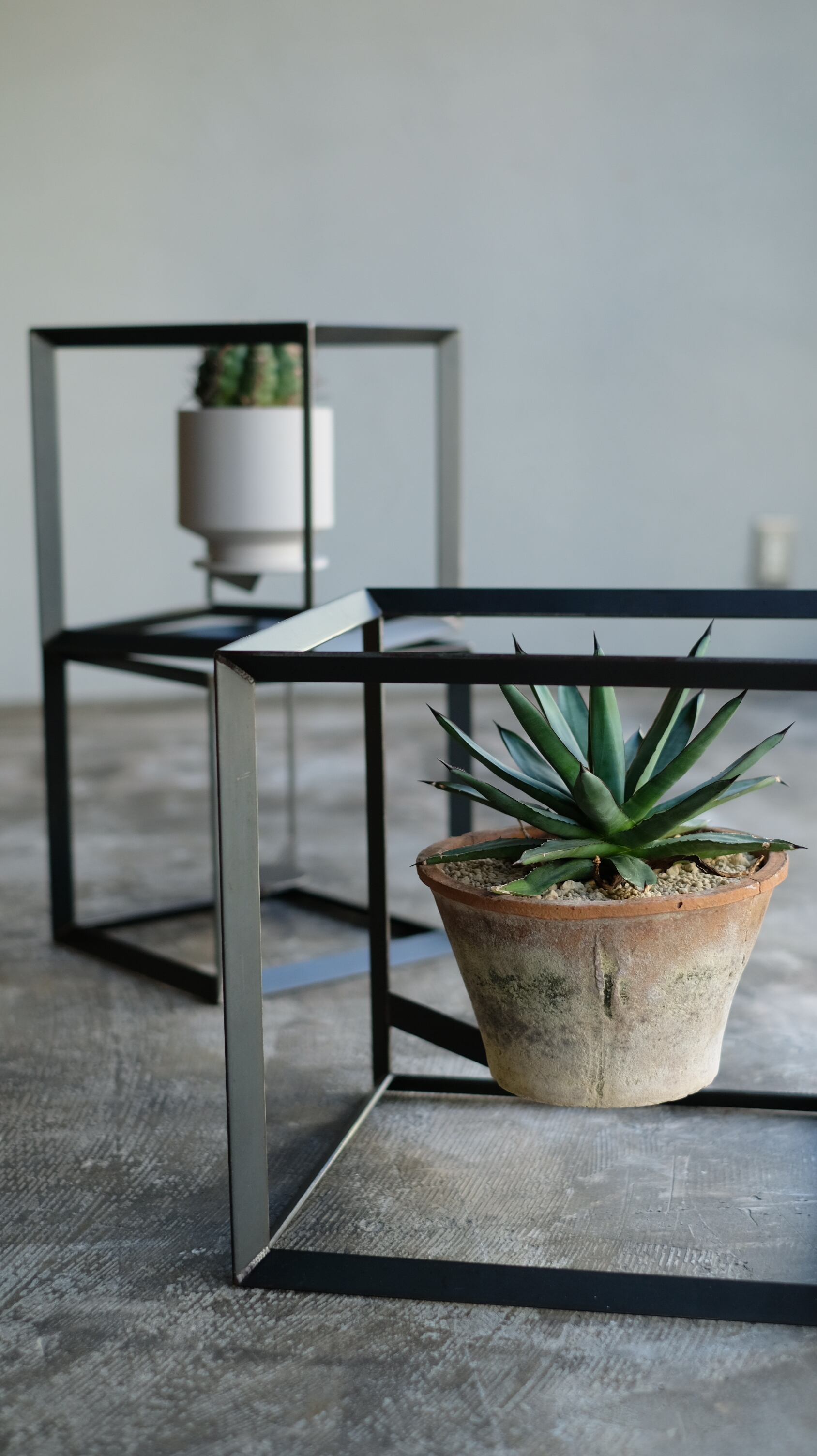 無骨なアイアンのキューブの中で、植物がすっと静かに浮いているように魅せるディスプレイボックス