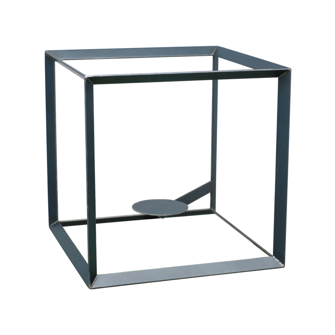 Cube shaped iron display box made out of rough iron, making the plant look like it is
