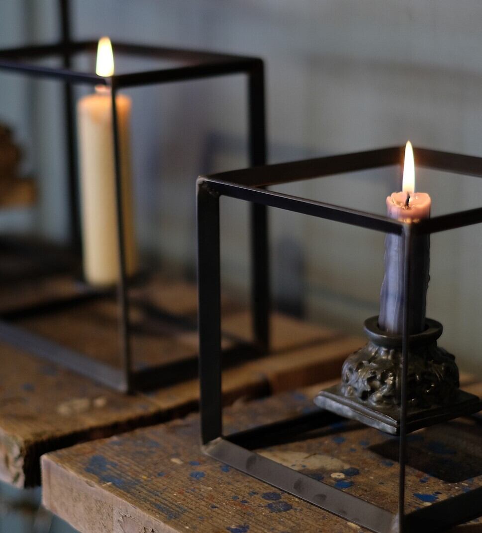 Cube shaped iron display box made out of rough iron, making the plant look like it is