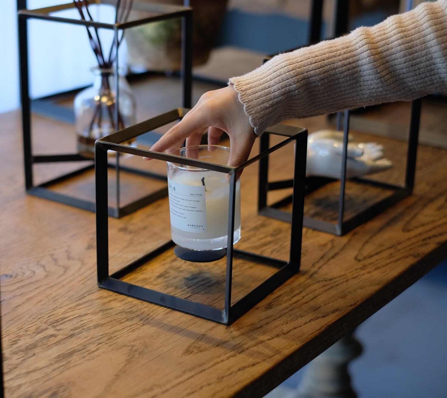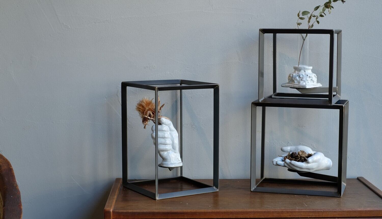 無骨なアイアンのキューブの中で、植物がすっと静かに浮いているように魅せるディスプレイボックス