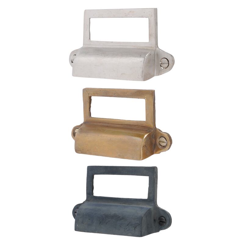 キャビネットや引き出しなどの真鍮製取っ手。こちらは上部がカード・ホルダーになっているので、引出の整理が簡単です。