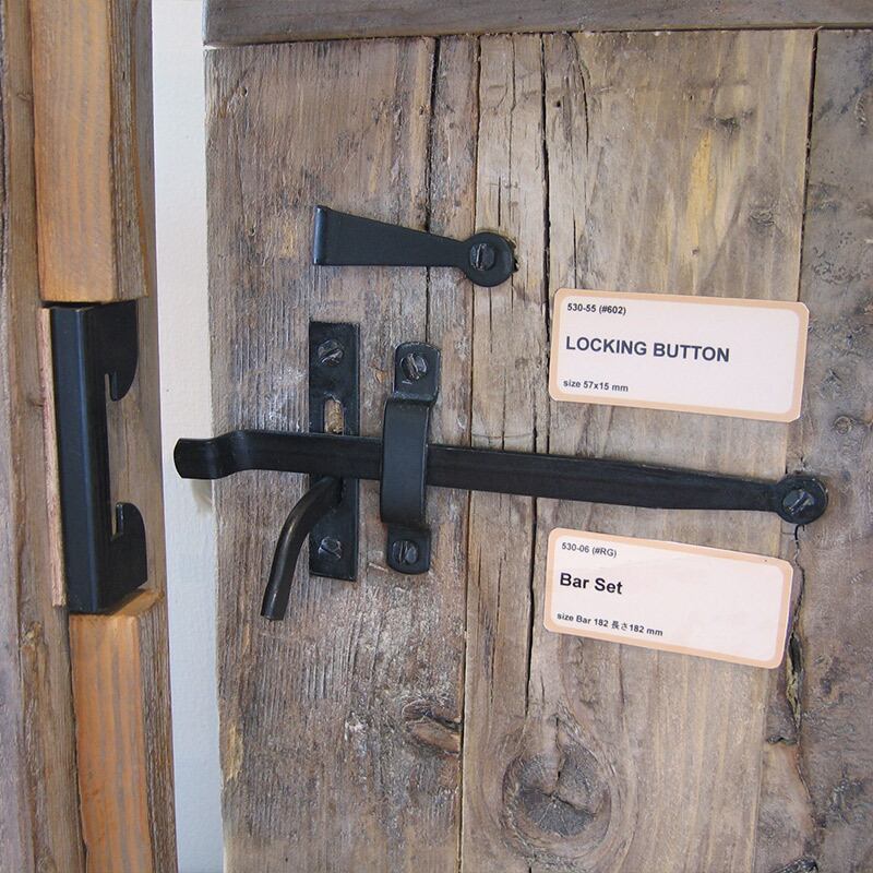 親指でつまみながらドアを開ける取っ手(サムラッチ)と対になる鉄製金物です。マットな黒塗装を施しています。