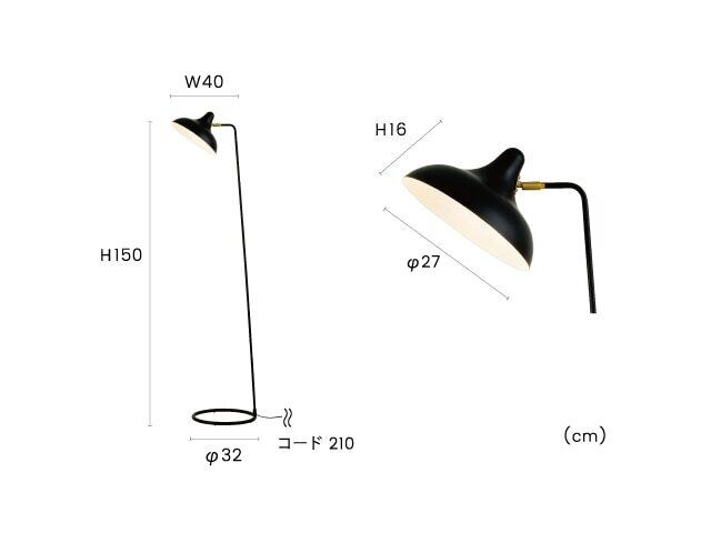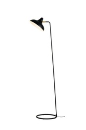 直線的な細い支柱にボーラーハットのようなセードを合わせた、モダンなフロアライト。