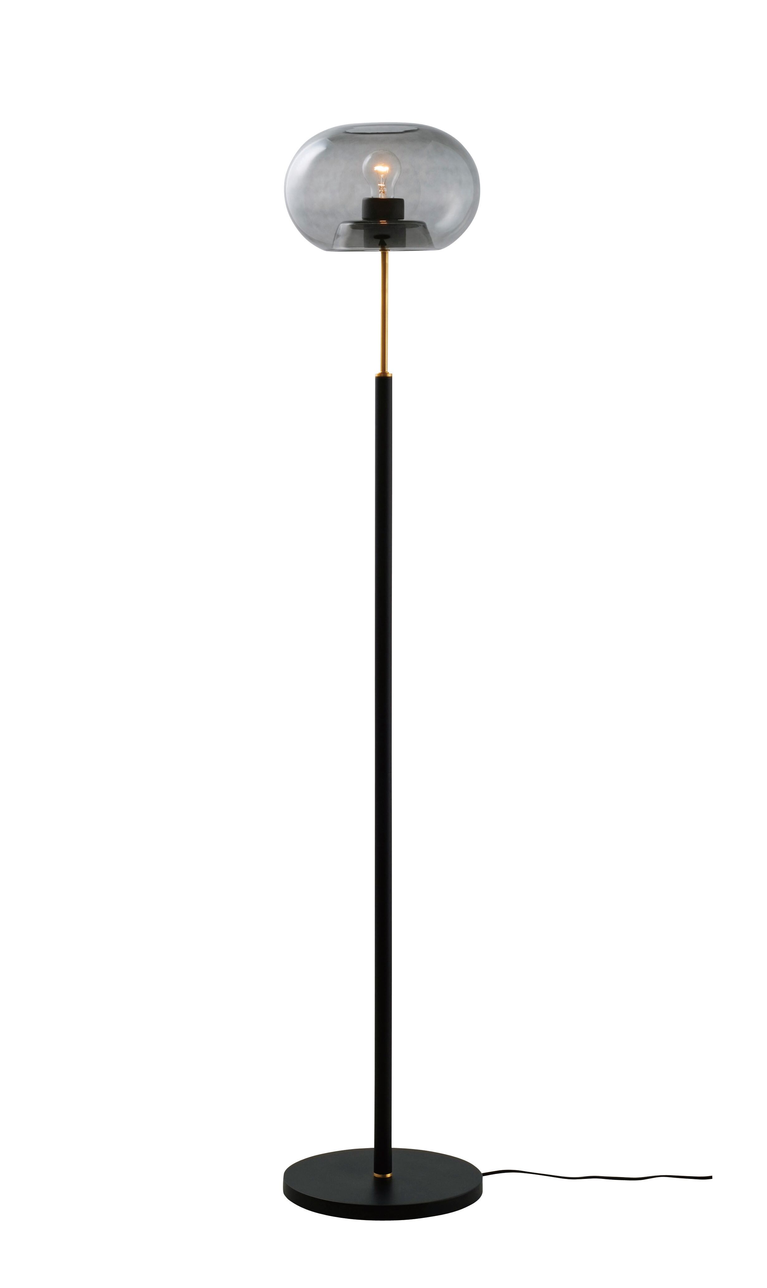 オーバルのガラスセードと直線的な支柱の洗練されたシルエットがスタイリッシュなフロアライト。