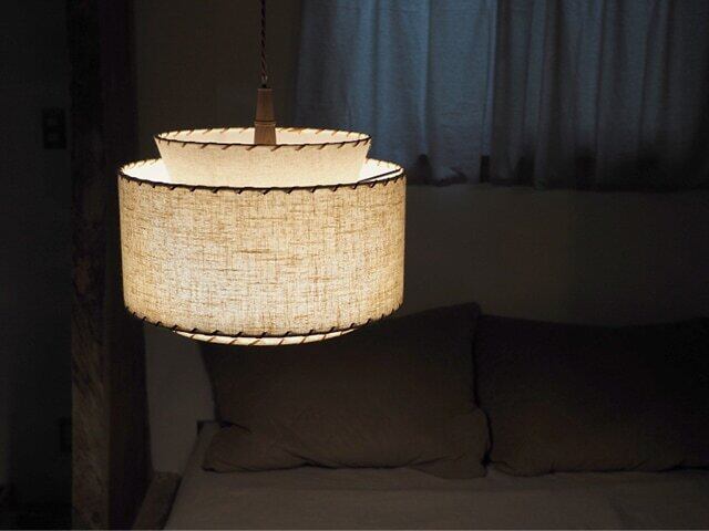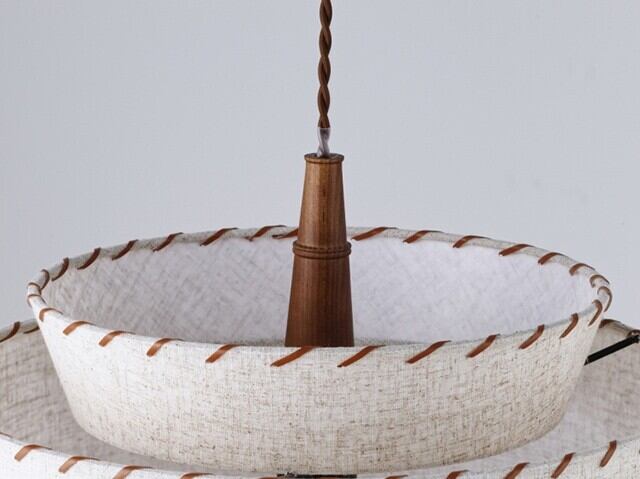 麻の入った風合い豊かな3枚のファブリックセードにウィップステッチを施した立体感のあるペンダントライト。