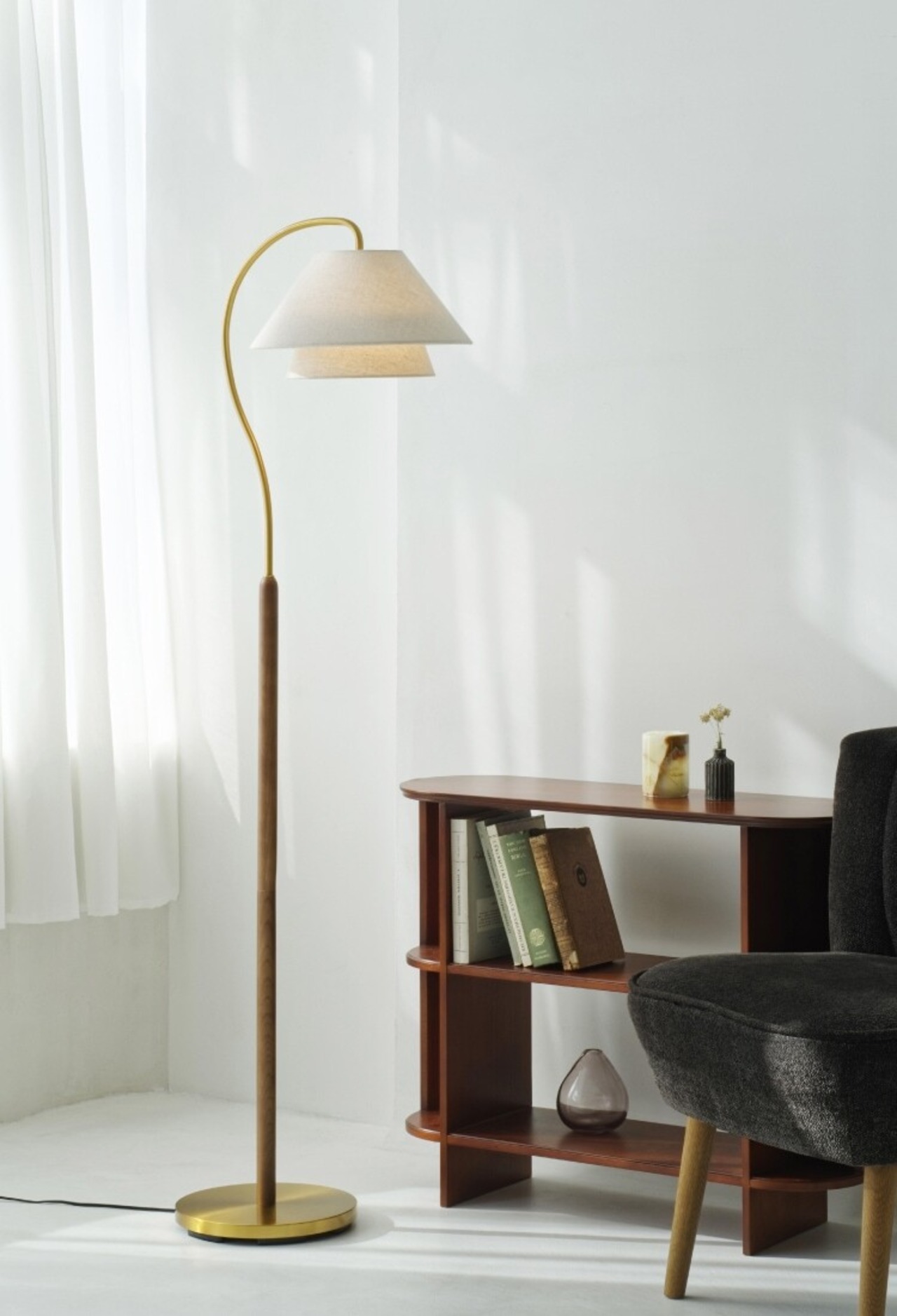 レイヤードされたファブリックセードと緩やかな弧を描く支柱がエレガントな印象のフロアライト。