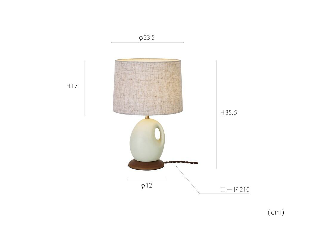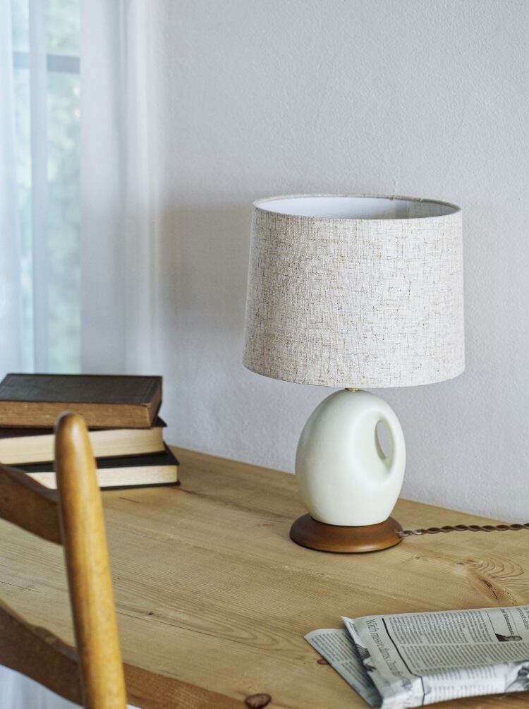 滑らかな質感の磁器に合わせたウッドベースと生成りのファブリックセードが、モダンなデザインにぬくもりを添えています。